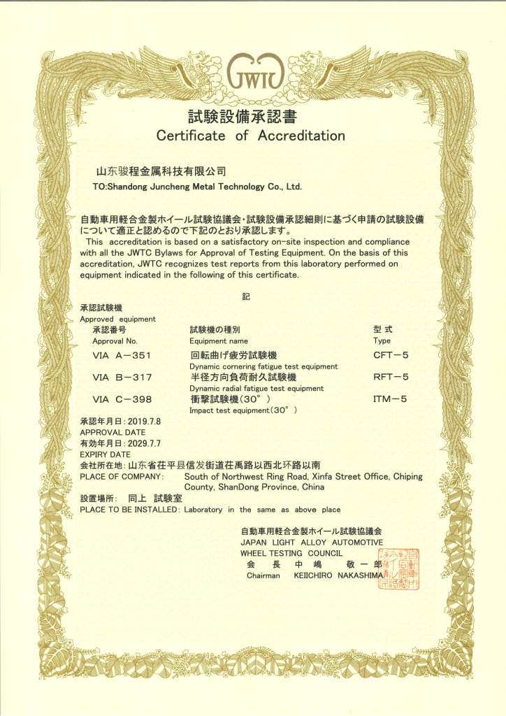 TUV APPROVED – 2024 IATF16949 Certification – Approval for Brazil IATF France – 039709 Product Test report JWL – Japan Light Alloy Wheel standard